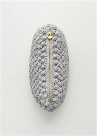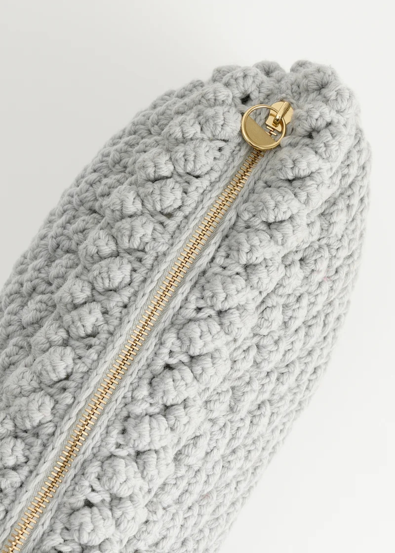 En rummelig, håndstrikket clutch lavet af kraftig højlands fåreuld. Clutchen er foret og har praktiske detaljer såsom en indvendig lomme og lynlåslukninger. Designet med et smukt mega-perle mønster, der tilføjer et karakteristisk udtryk.