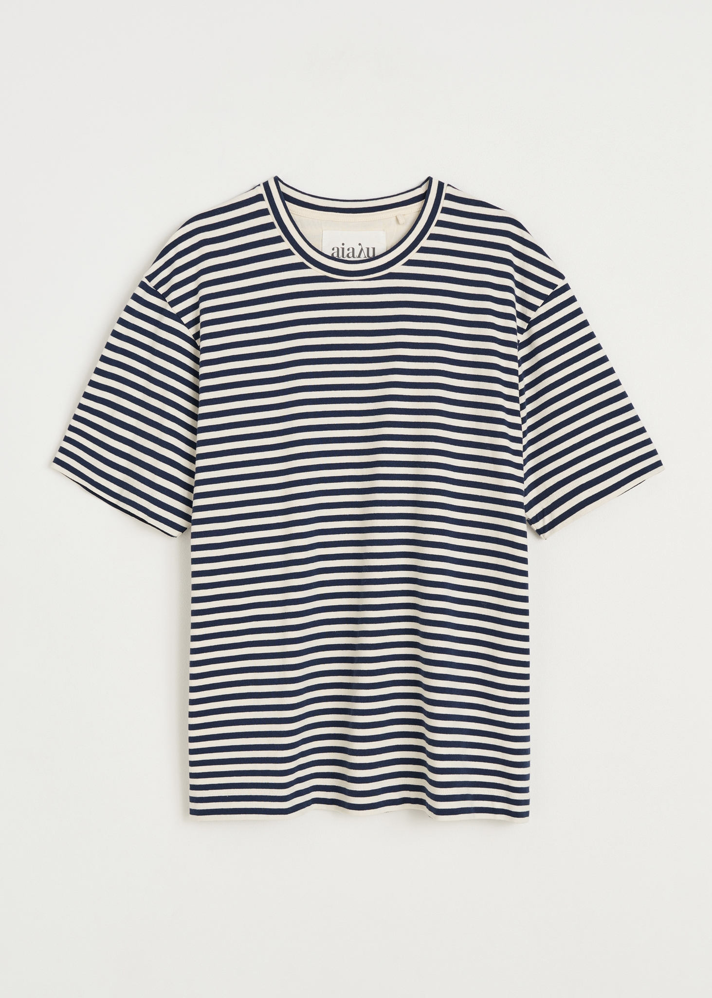 En klassisk t-shirt fremstillet i en blanding af kraftig, blød, genanvendt og økologisk bomuldsjersey. Designet med inspiration fra klassiske menswear t-shirts i en let oversized og regulær pasform med rund hals, korte ærmer og et broderet aiayu-logo bagpå.