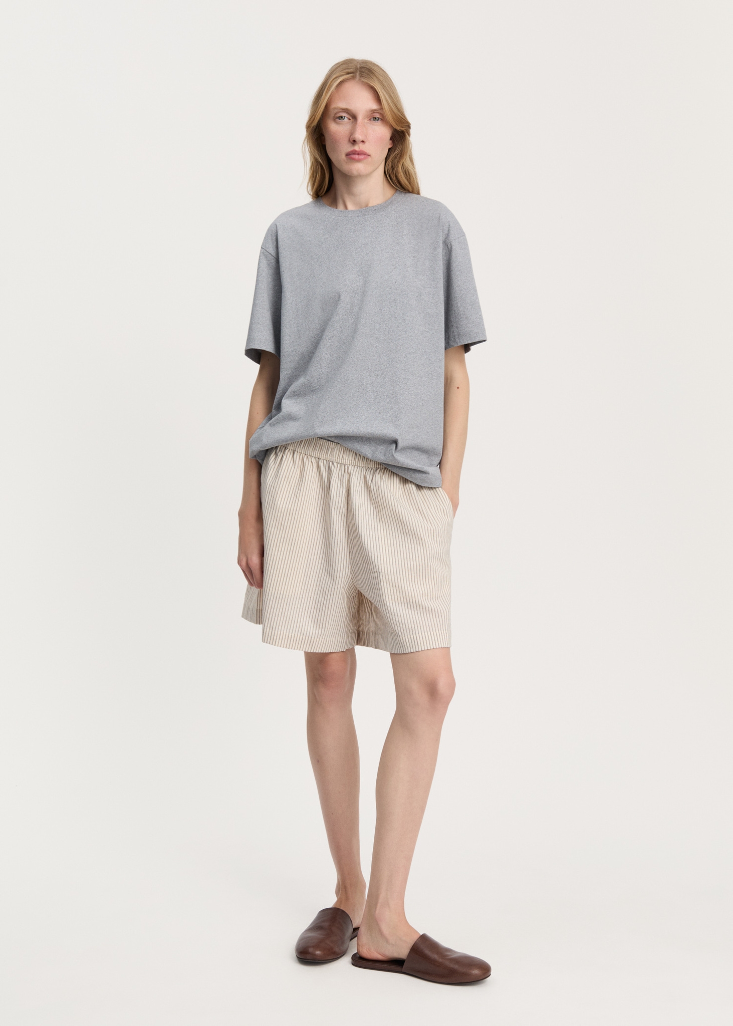 Et par casual shorts fremstillet i blød, ufarvet økologisk bomuld og vævet med kontrastfarvede striber. Shortsene er designet i enoversized pasform med en elegant, svajende effekt og et bredt, elastisk bindebånd i taljen.