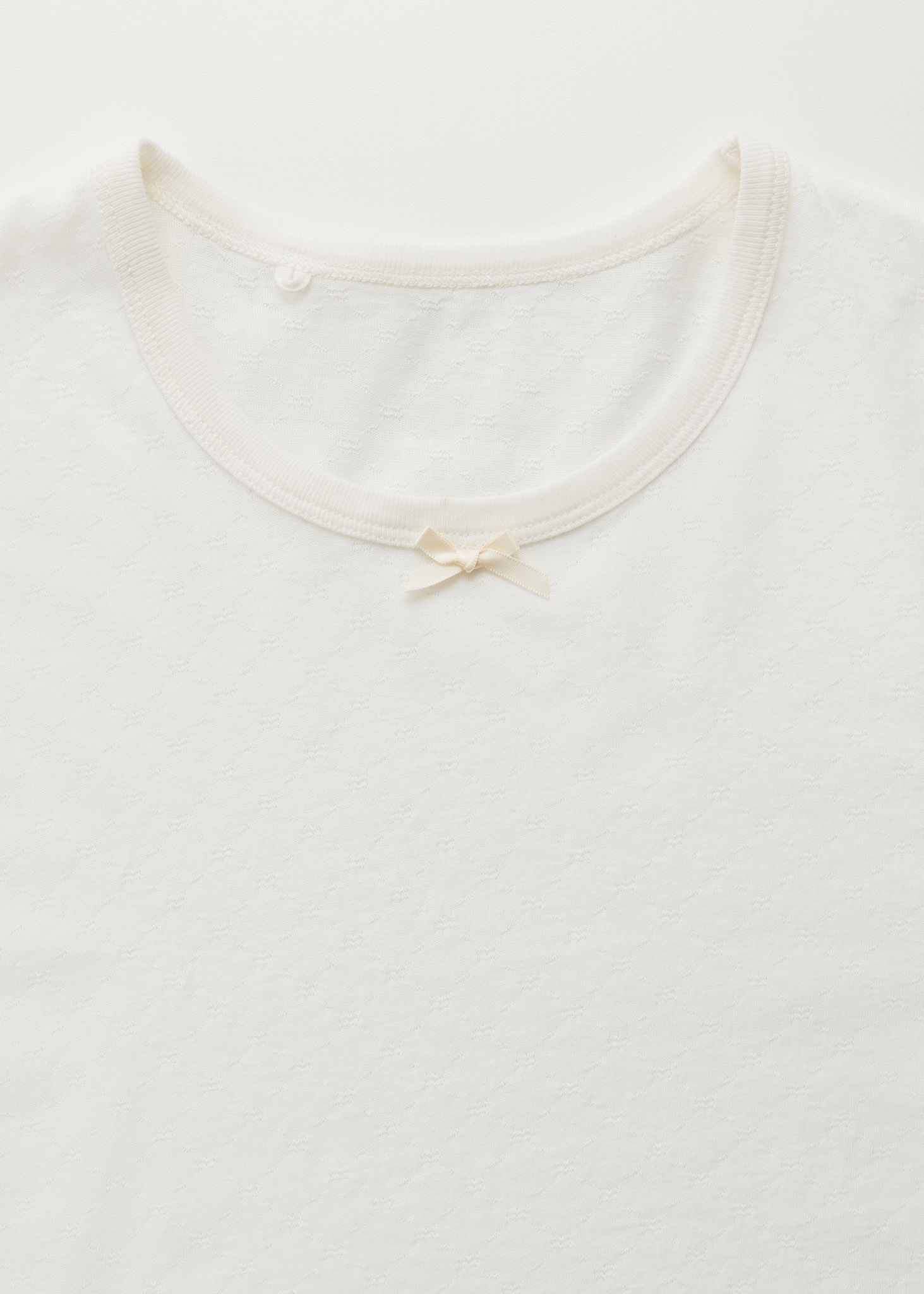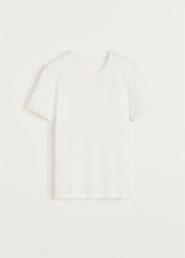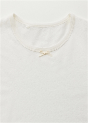 En klassisk t-shirt fremstillet i en let pointelle-inspireret mesh jersey, der giver et delikat og detaljeret udtryk. T-shirten har en dekorativ sløjfedetalje midtfor samt ribkanter ved halsen og ærmerne. Den tætsiddende pasform skaber en elegant og feminin silhuet.