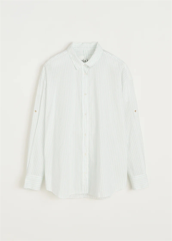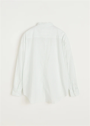 En tidløs skjorte fremstillet af økologisk bomuldspoplin med en fin, smal, mintfarvet stribe. Designet i en afslappet, voluminøs pasform med en detaljeret, kurvet og let sænket bagkantlinje, perlemorsknapper og en lukning på ærmerne, så skjorten nemt kan bruges med oprullede ærmer.