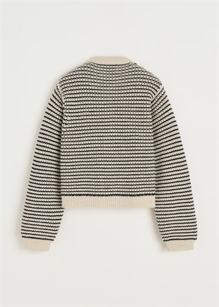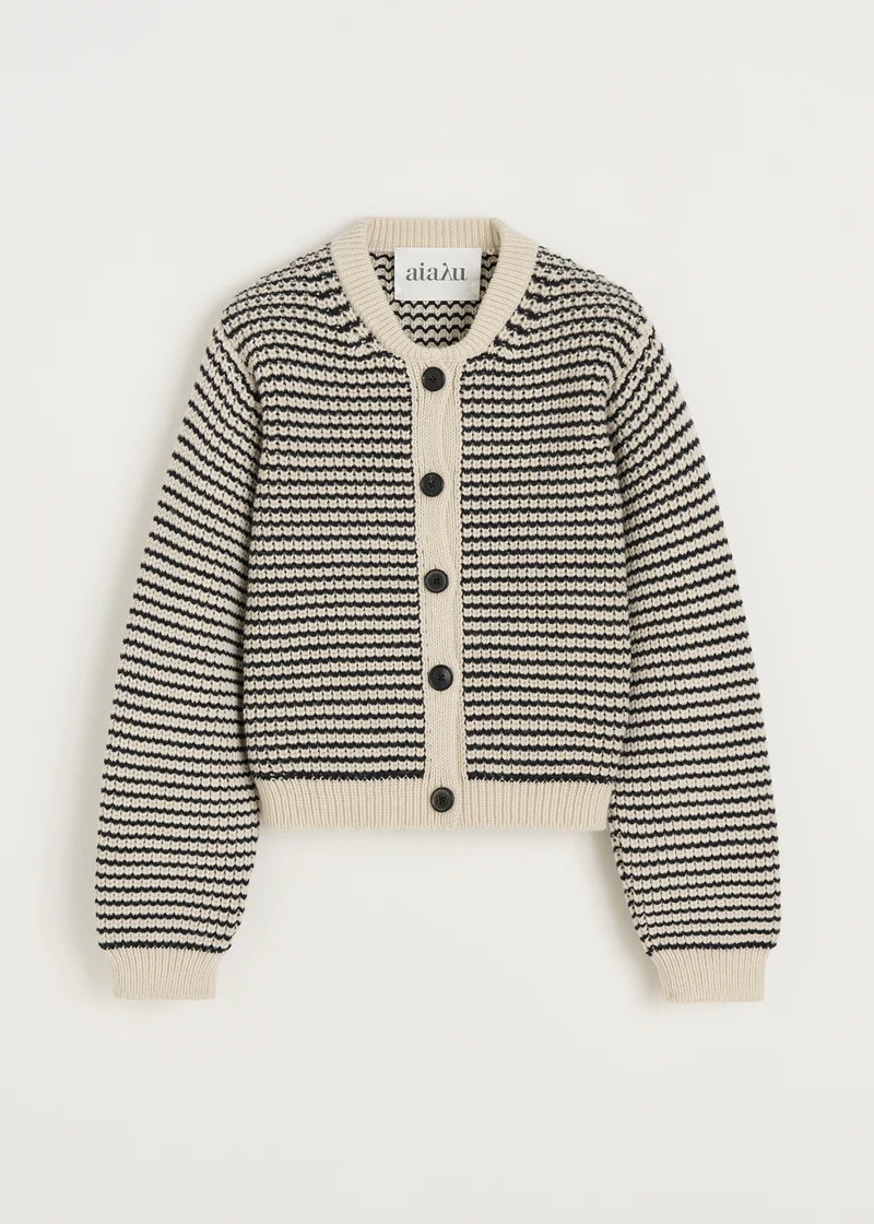 En raffineret, stribet cardigan fremstillet af kraftig, patentstrikket højlandsuld. Designet i en kantet pasform med en let, kort silhuet, der skaber et skulpturelt udtryk, og er detaljeret med hornknapper og ribkanter.
