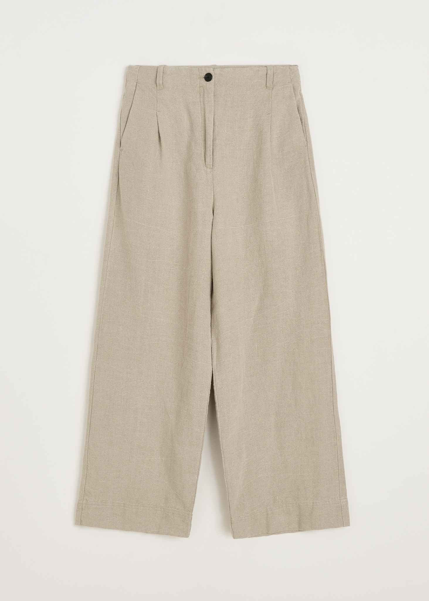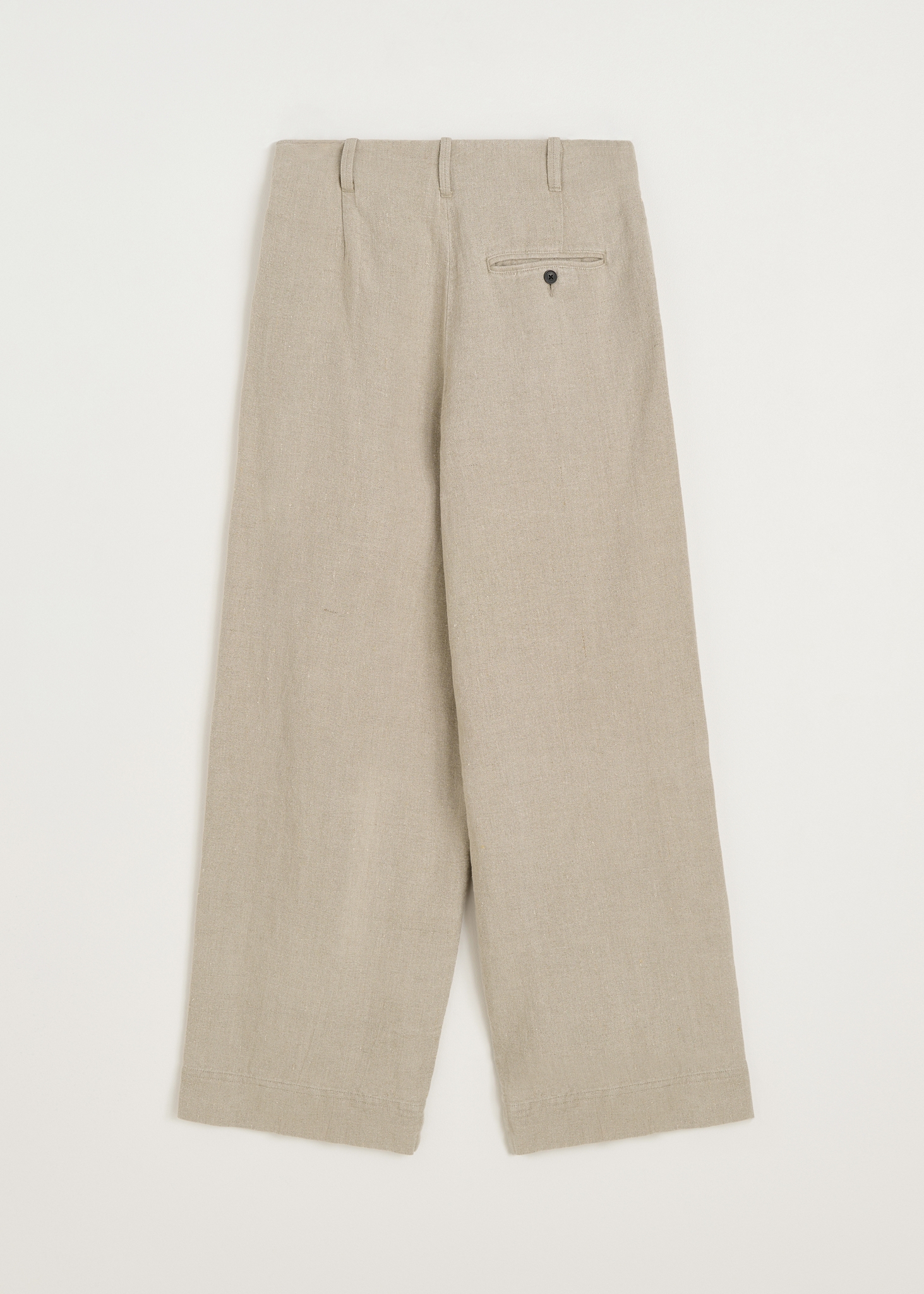 Et par tidløse bukser fremstillet af fremstillet af kraftig, uvasket hør, der skaber et skulpturelt fald. Designet i en afslappet pasform med mellemhøj talje, vide ben, skrålommer, dybe læg, paspoleret baglomme og håndlavet hornknap.