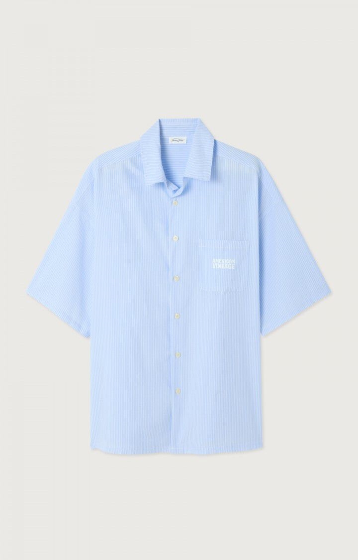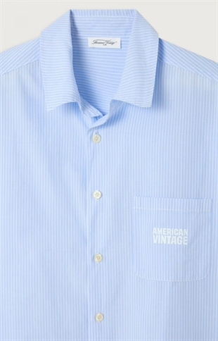 Kortærmet skjorte med løs pasform, klassisk krave og knaplukning foran. Den har en påsyet brystlomme med “American Vintage”-logo. Materialet er fint og let.