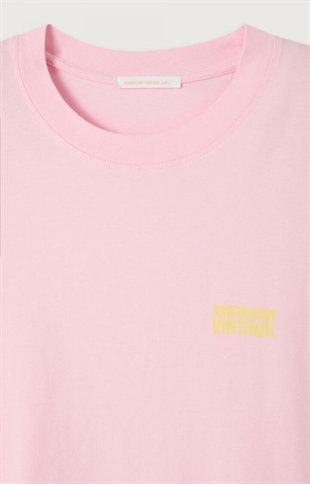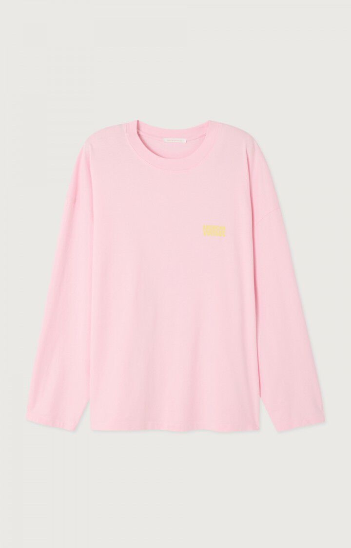 Skøn oversized t-shirt med lange ærmer og rund hals fra American vintage, i den fineste candy floss farve med gult kontrast logo-print på brystet.