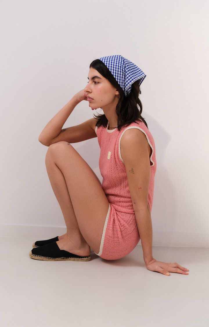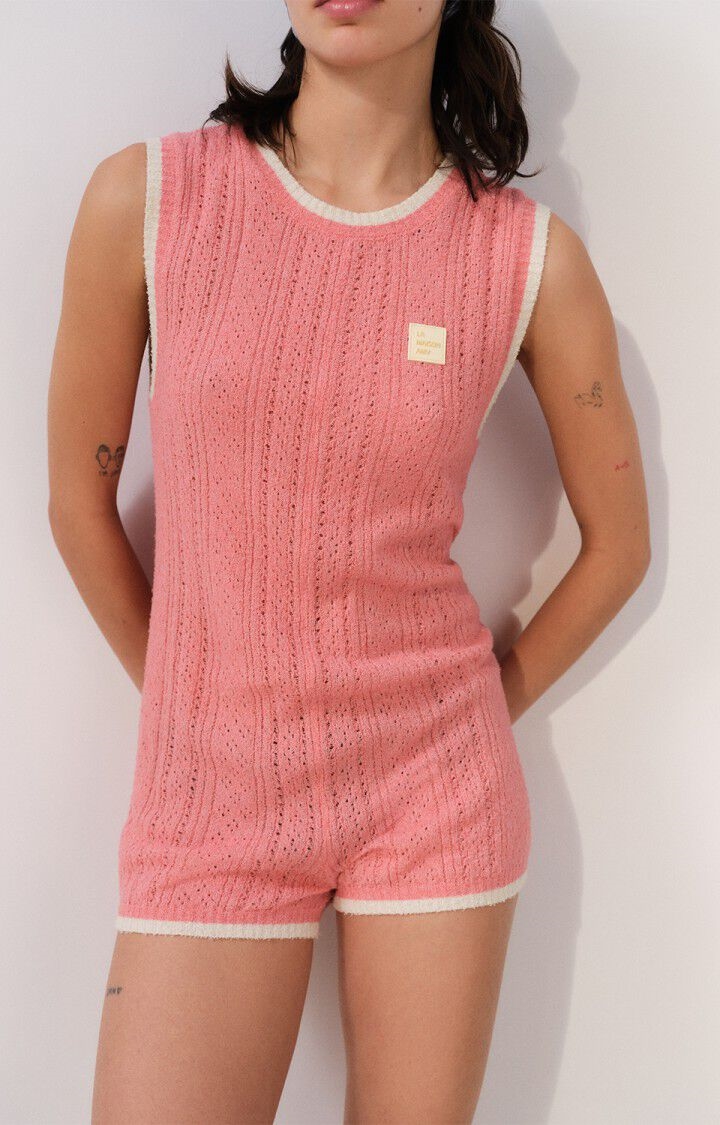 Nagoo cropped jumpsuit til kvinder skiller sig ud med sin tanktop med rund hals og retro vibe. Den er fremstillet i en ultralet strik med frottéstruktur, som giver en enestående blødhed og komfort mod huden. Inspireret af strandtøjsæstetik skaber den en sommerlig silhuet, perfekt til solrige dage, med et selvsikkert vintage-look.