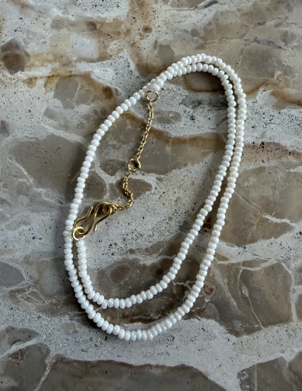 Smuk håndlavet kulørt glasperlekæde, med forgyldt messing S-lås og forlænger stykke på ca 6 cm, brug dem enkeltvis eller som layering med feks Mimi et toi kæderne.