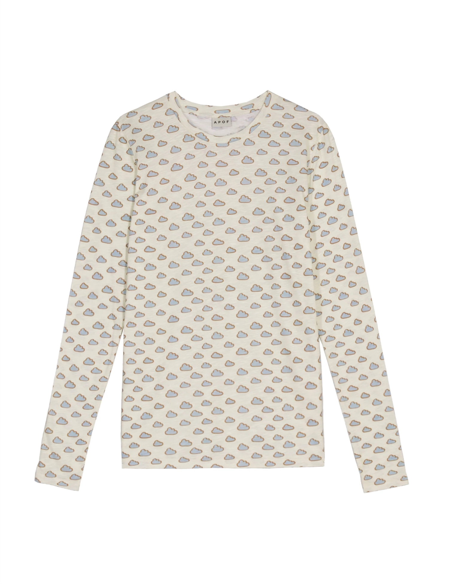 Opdater din garderobe med APOF - Cinna T-shirt. Denne smukke langærmede T-shirt er perfekt til enhver lejlighed. Lavet af det blødeste bomuld og dekoreret med små blå skyer, tilføjer den et sødt touch til dit outfit. Brug den under skjorter eller strik for et trendy look.