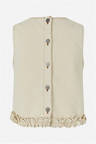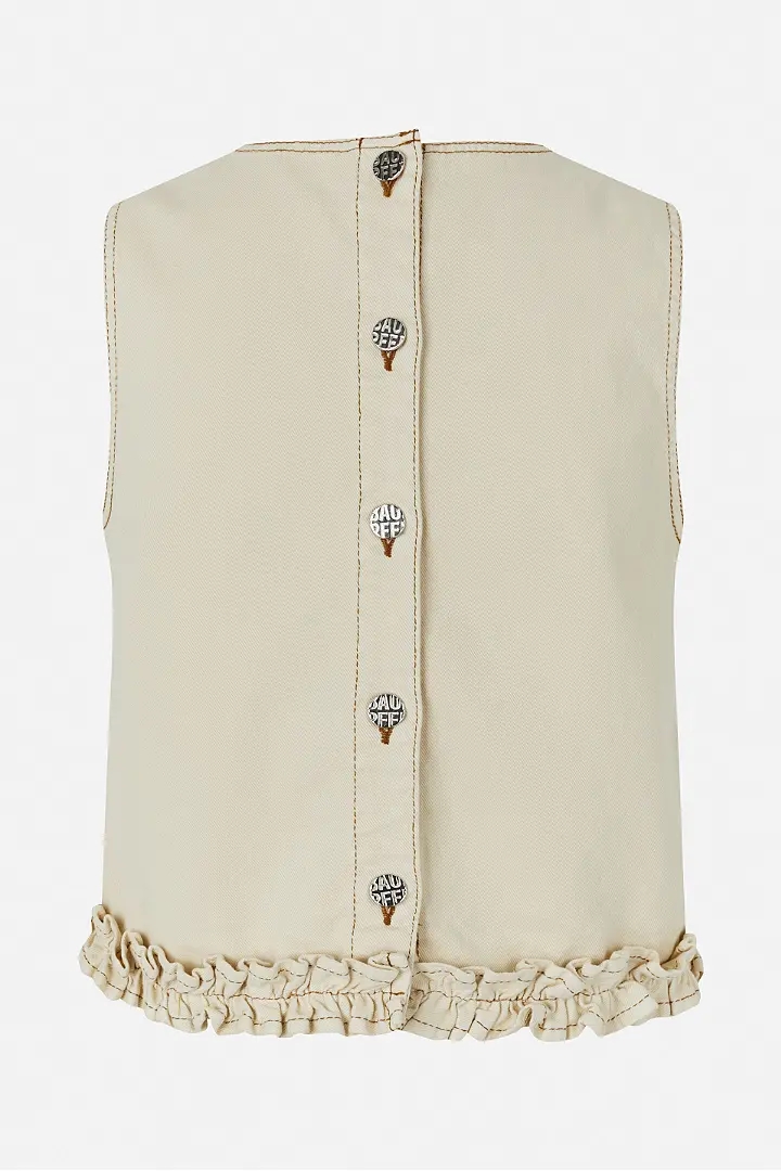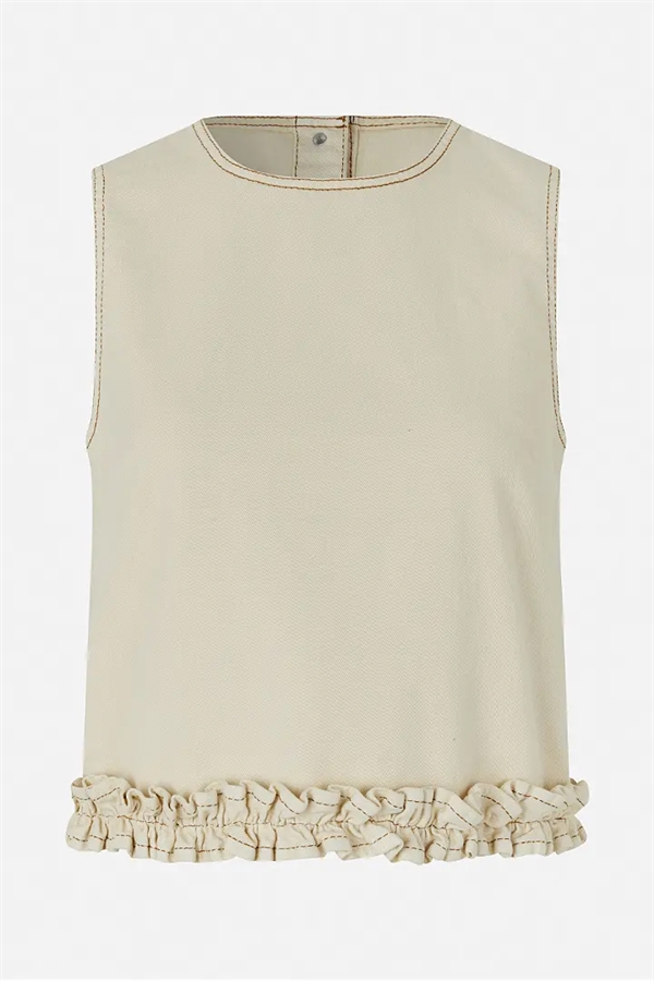 Madie-toppen er en denimtop uden ærmer, fremstillet i økologisk bomuldstwill. Den har en cropped og afslappet pasform med flæser ved kanten.