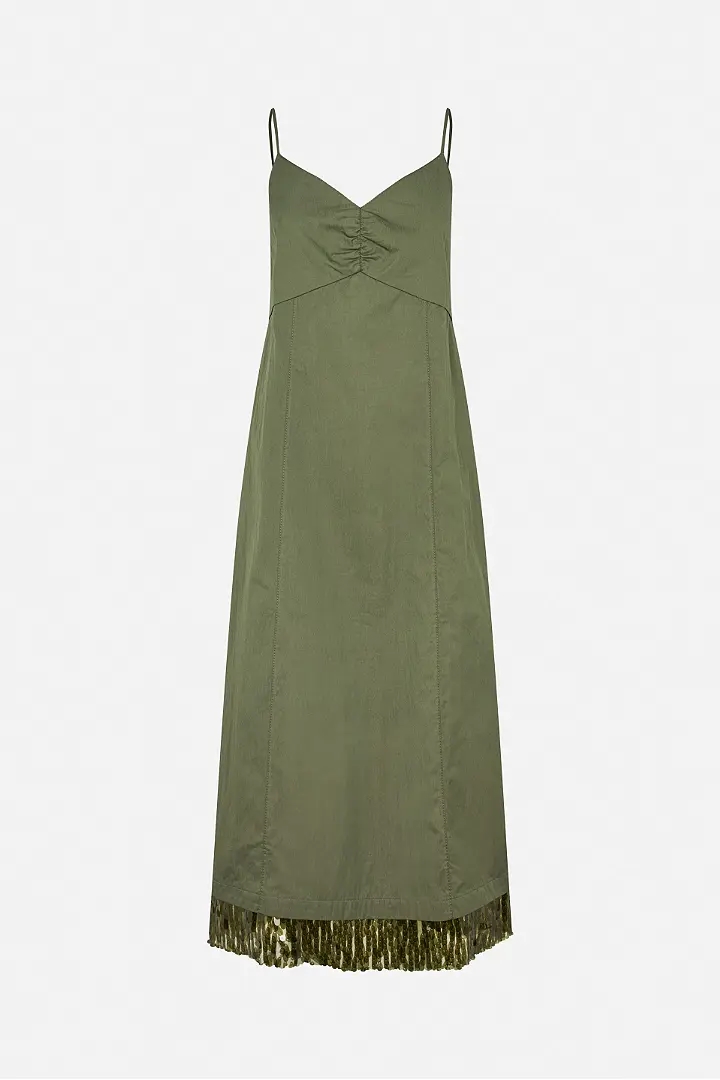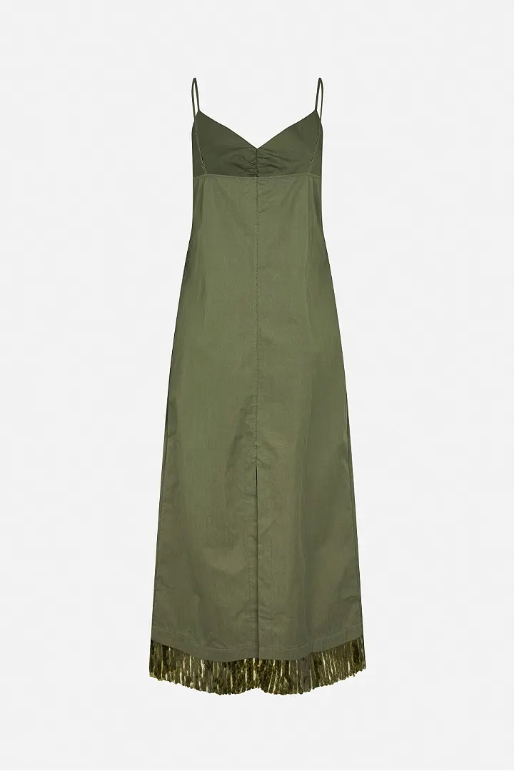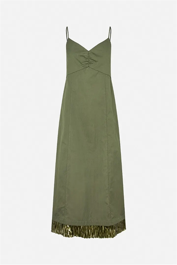 Atelia-kjolen er designet i et A-snit. Maxi-kjolen er tætsiddende ved brystet med justerbare stropper, en slids bagpå og pailletdetaljer forneden.