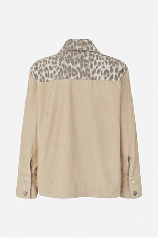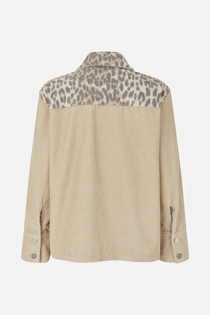 Berina-jakken er en blanding af ribbet fløjl og leopardprintet bomuld. Med sin løse, kasseformede pasform og sænkede skuldre giver jakken et afslappet udtryk, mens de påsyede lommer foran tilføjer et praktisk touch.