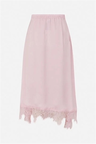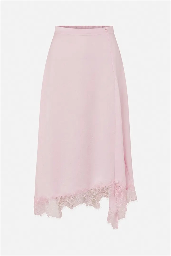 Sophie-nederdelen er en højtaljet midi-nederdel med elastik bagpå og en asymmetrisk kant forneden med blonde.