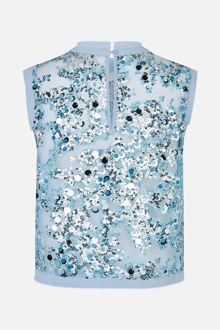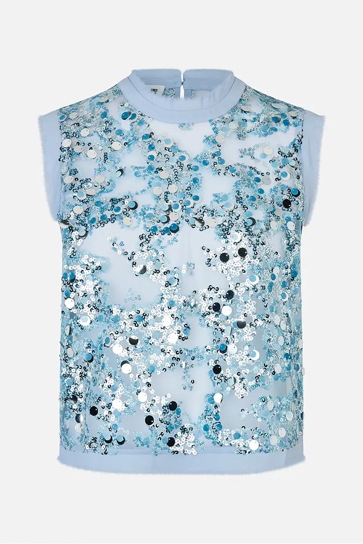 Manira-blusen er en bluse med en gennemsigtig, lige pasform, unikke pailletdetaljer og flossede kanter.