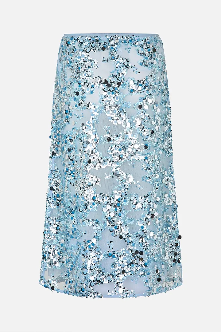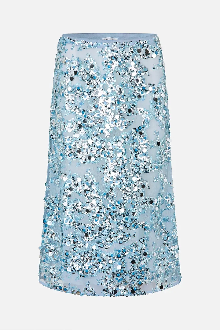 Shania Skirt er en højtaljet midi-nederdel i mesh med fine pailletdetaljer. Den er foret for komfort og har en elastisk talje, og kan styles med Manira Blouse.