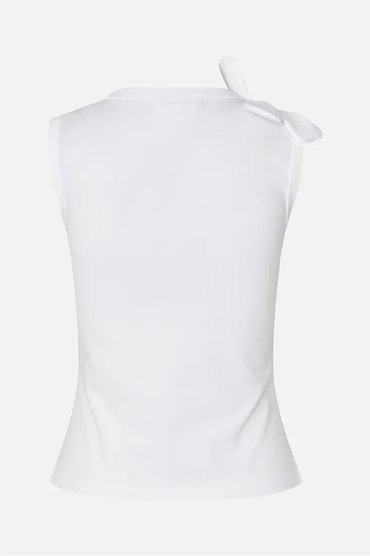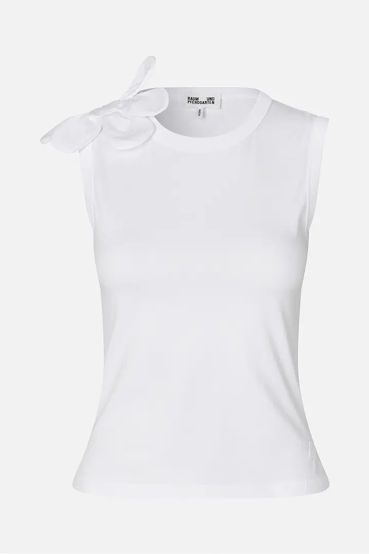 Jone Top er en tætsiddende tanktop i 100% økologisk bomuld. Den er designet med rund hals og har en fin blomsterdetalje på skulderen.