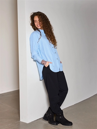 Beate bukser er designet med fokus på komfort og et moderne, enkelt udtryk. Den faste linning med bæltestropper giver et rent look, mens benene har let volumen og barrel form, hvilket skaber en afslappet form. Den glatte overflade giver bukserne et elegant præg, der gør dem nemme at bruge både til hverdag og mere sammensatte outfits.