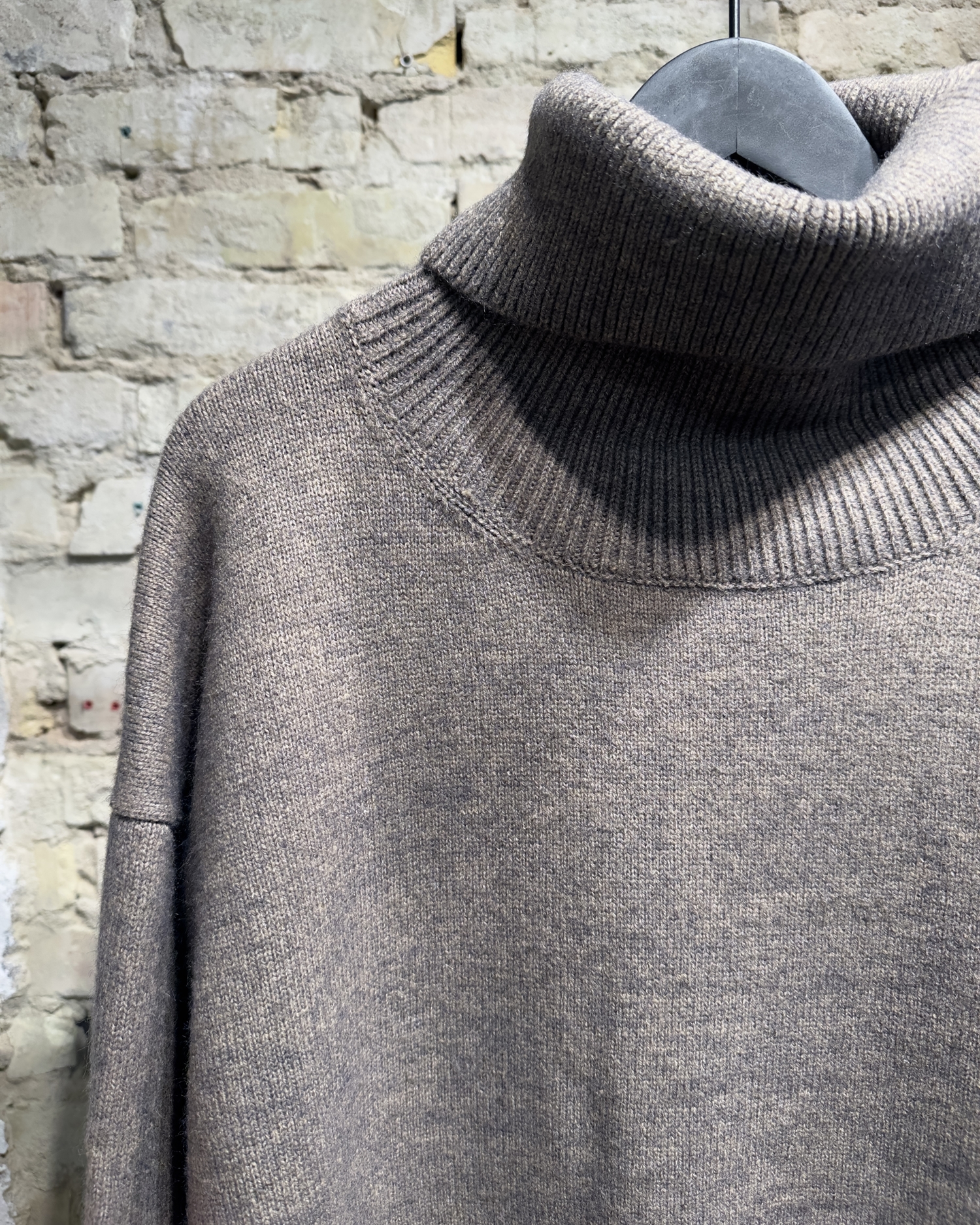 Olga er en blød, langærmet strik med stor rullekrave i 60% naturmateriale. Olga er one size.