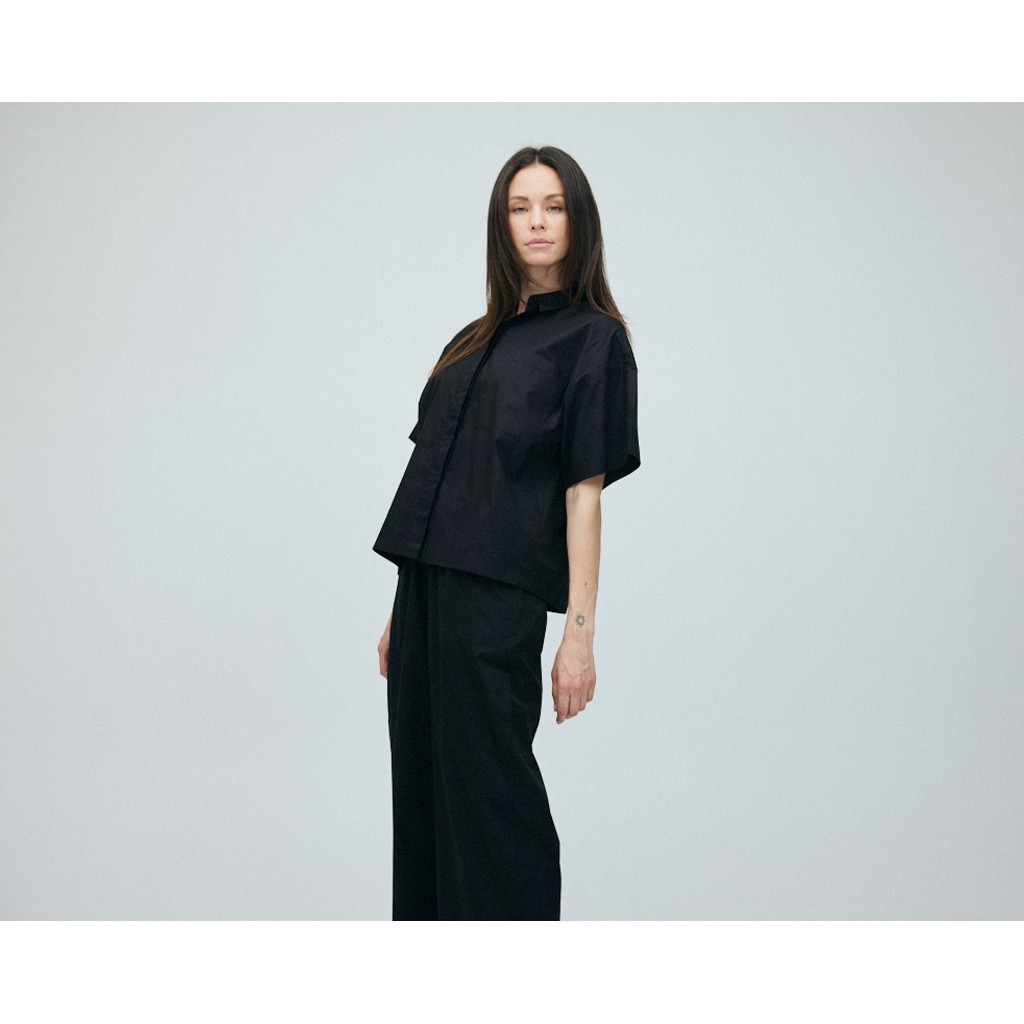Nice skjorte er kort og 'boxy' i udtrykket med korte, vide ærmer. Skjorten er gennemknappet og har en lille, klassisk krave og brystlomme.