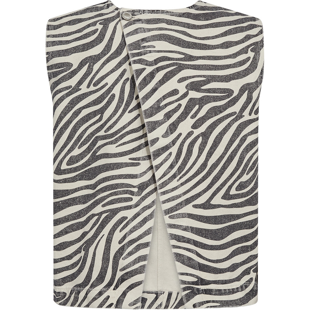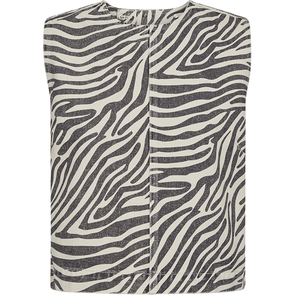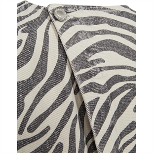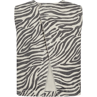 Toppen har en boxy og struktureret pasform med lige snit gennem kroppen og er uden stretch. Den er detaljeret med et gennemgående print og lukkes med knap ved skulderen, hvilket fuldender det rene og minimalistiske udtryk.