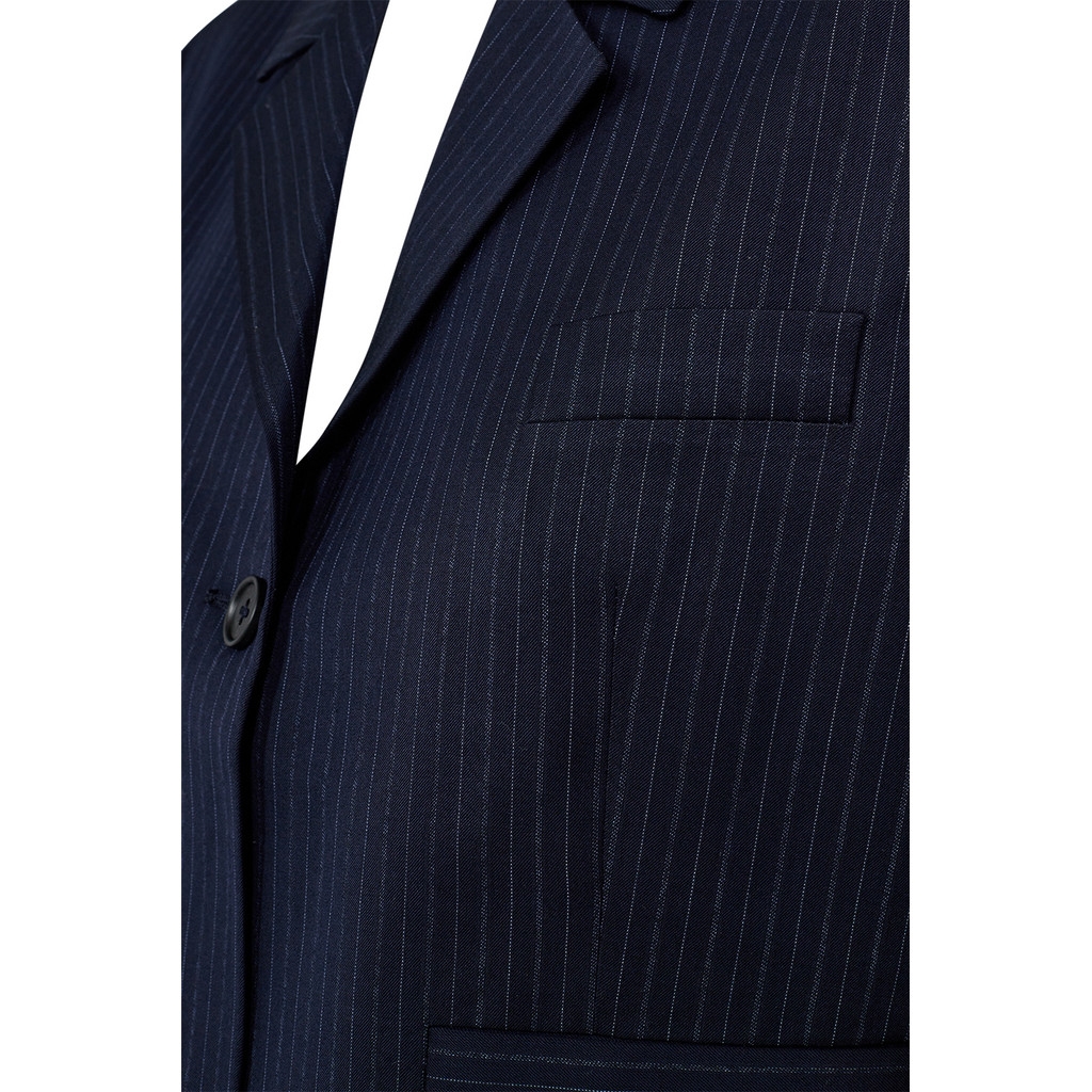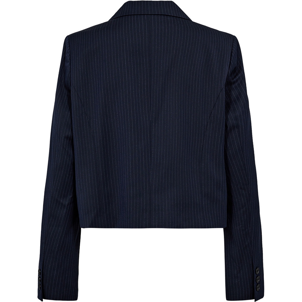 Tilpasset, kort og selvsikkert cool. Paula er vores fortolkning af den moderne blazer - designet med rene linjer, skarpe revers og en kasseformet, kort silhuet. De marineblå nålestriber tilfører en raffineret, maskulin kant, mens den korte længde tilføjer et friskt og feminint twist.