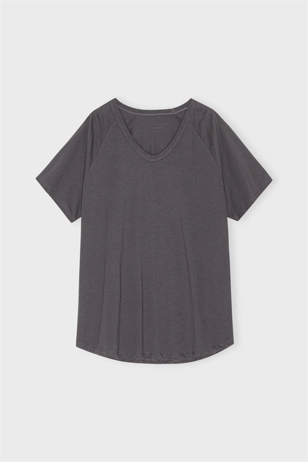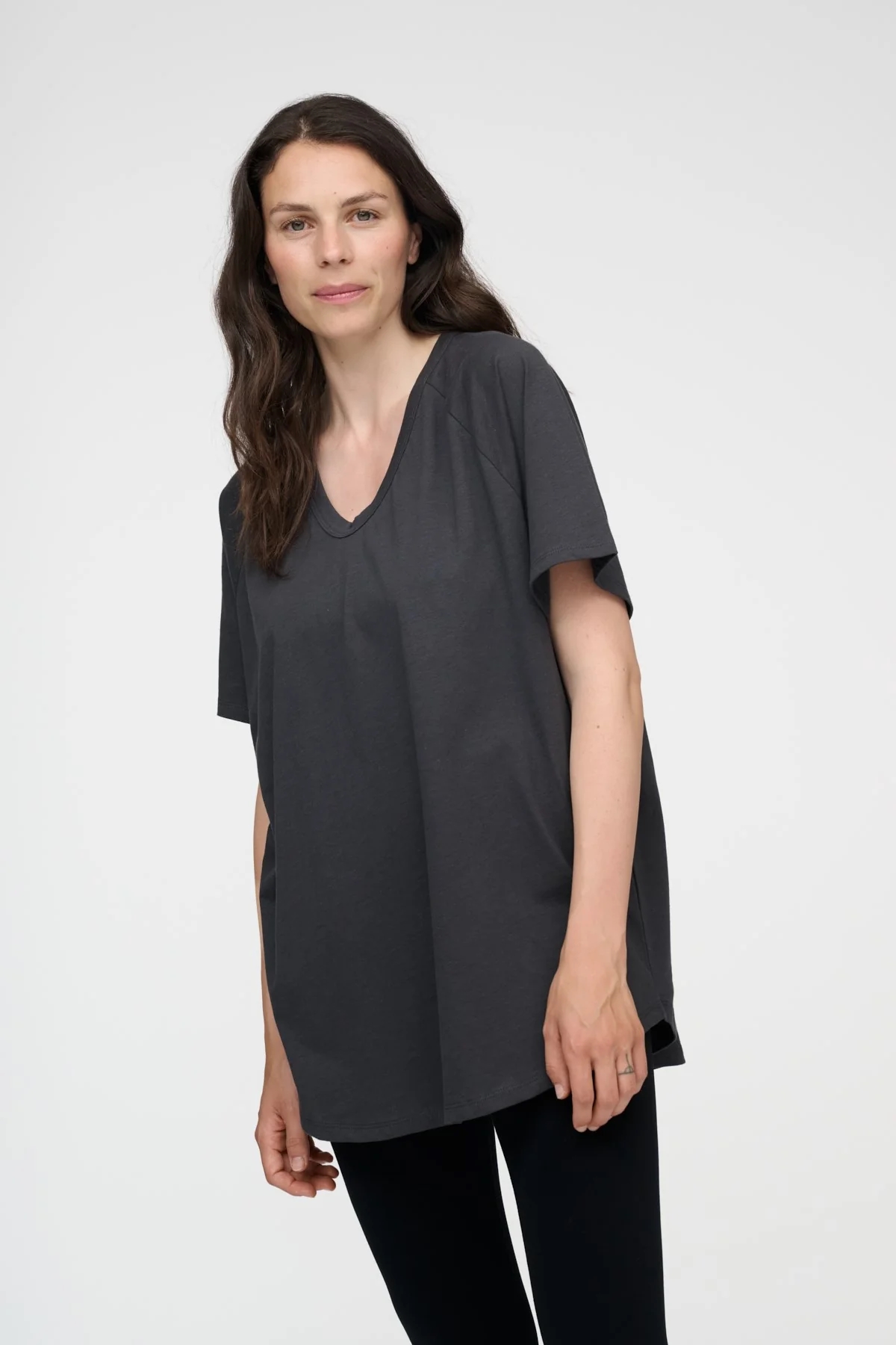 Dejlig oversized, mørkegrå t-shirt. Et musthave i din garderobe. T-shirten har en V-hals og samme længde foran og bagpå. Brug den til yoga, afslappede dage derhjemme eller style den til en arbejdsdag. Bemærk at modellen er onesize.