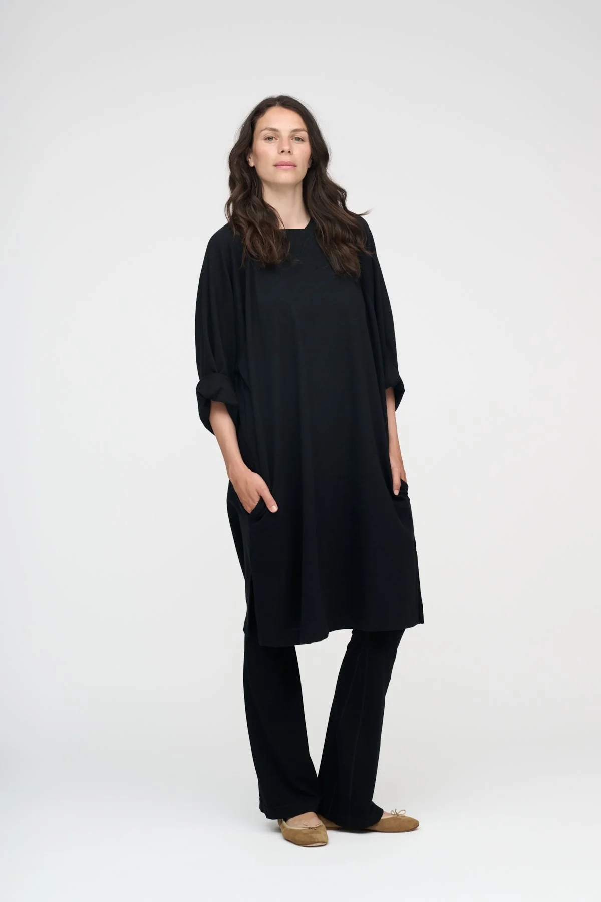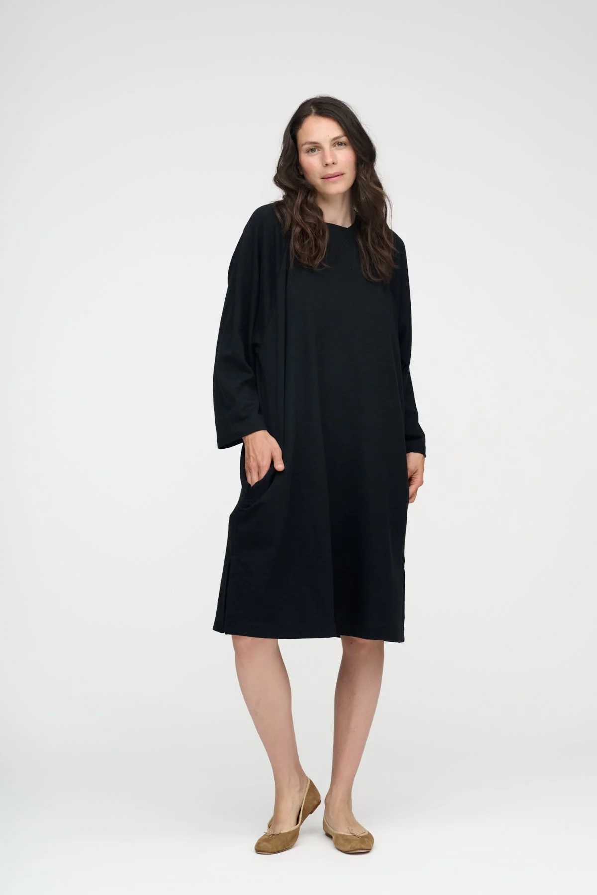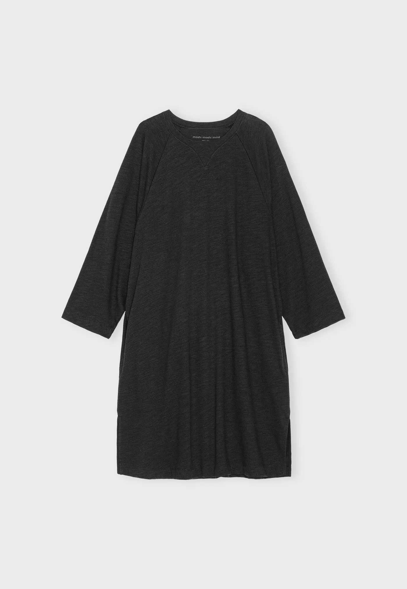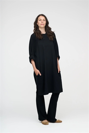 Sort, enkel kjole i en let oversized pasform med rund hals, diskret mønstret vævning og lange ærmer.