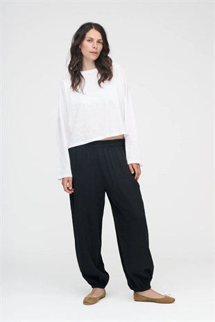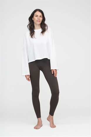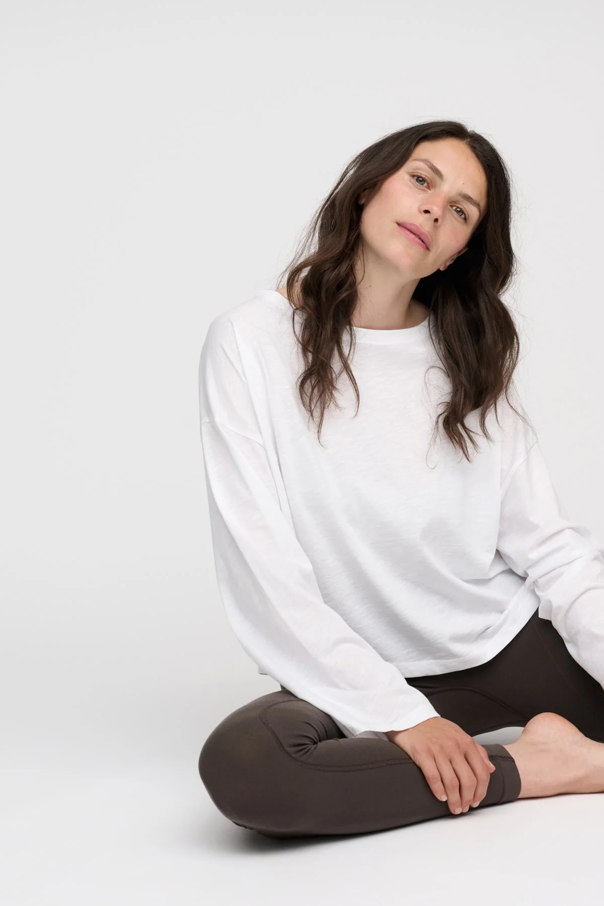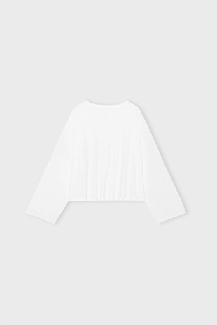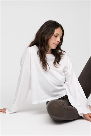 Langærmet, enkel hvid T-shirt—et essentielt stykke til din garderobe. T-shirten har en dekorativ bred rund halsudskæring og lange, brede ærmer. Brug den til afslappede dage derhjemme, lette træninger eller style den til en dag på kontoret.