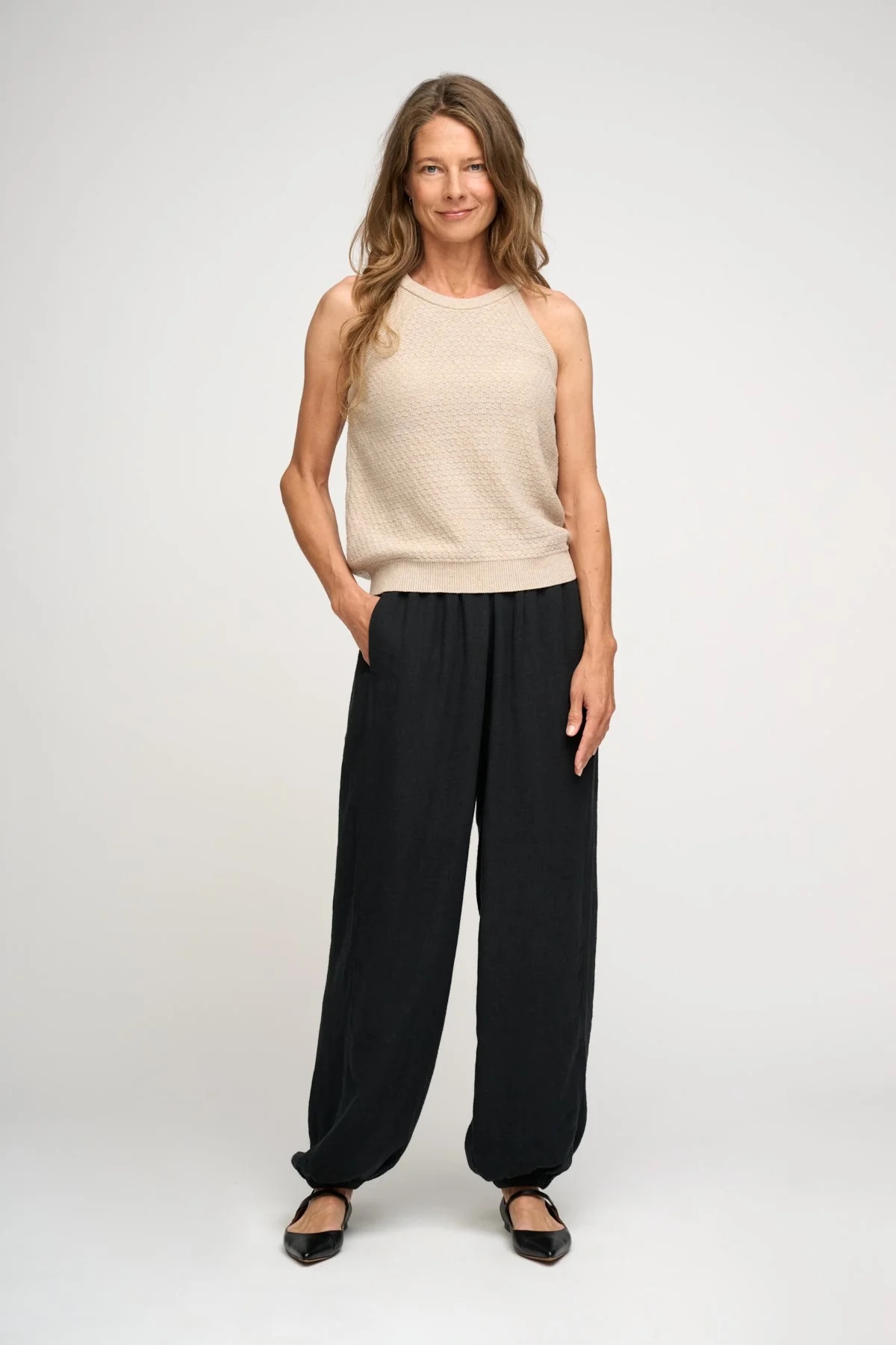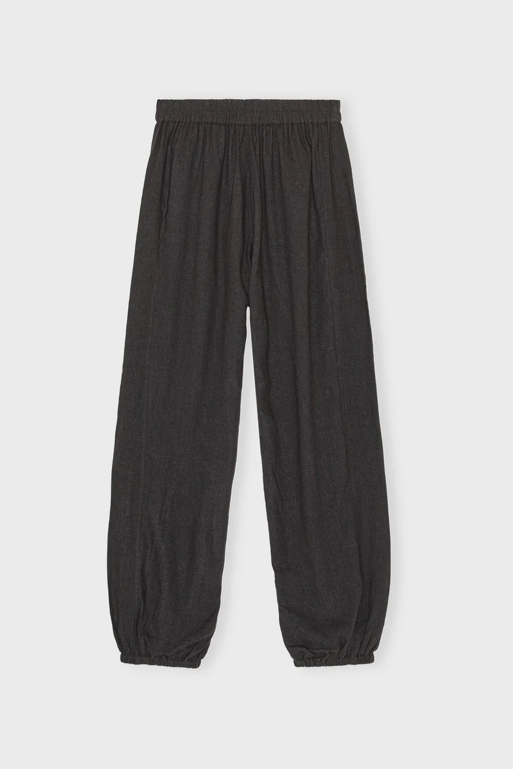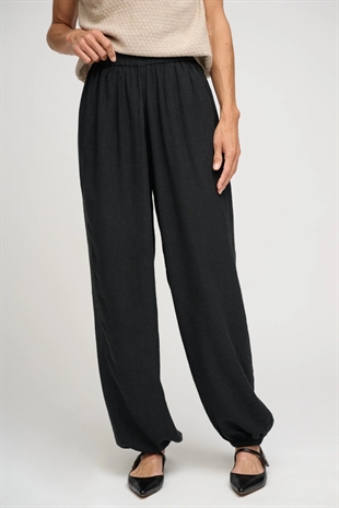 Behagelige sorte bukser i løstsiddende pasform med en blød, elastisk talje og elastik ved anklerne. Bukserne har brede ben og sidelommer.