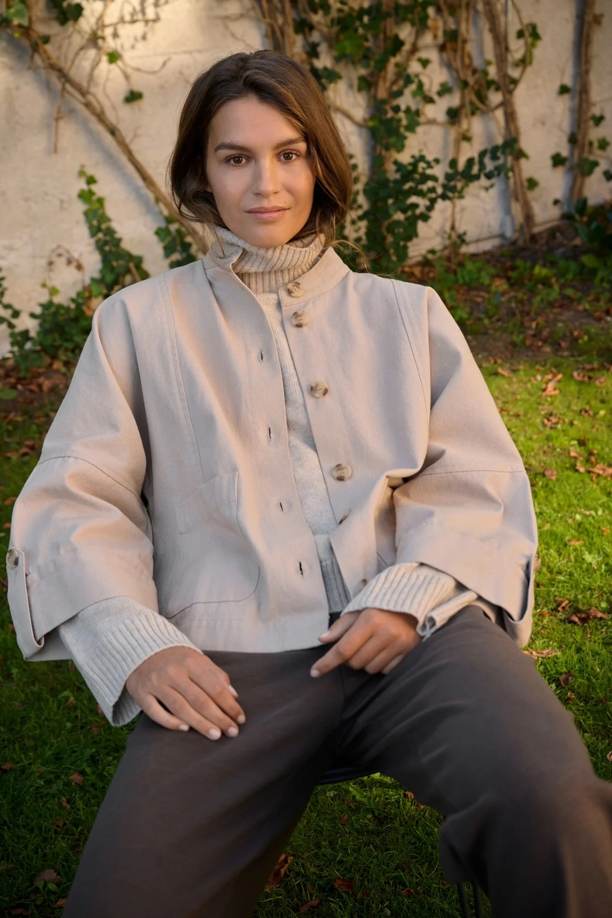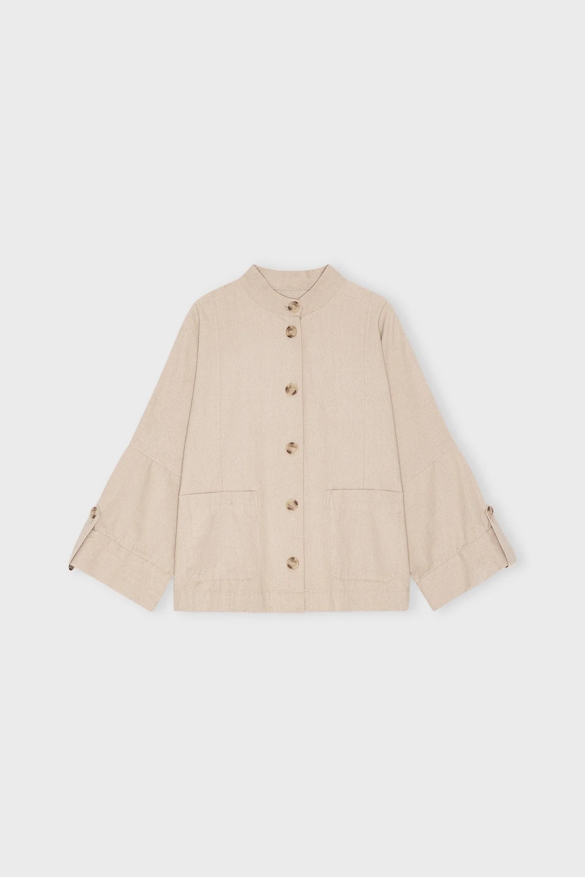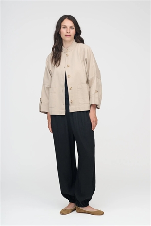 Beige skjortejakke i en oversized pasform med en mandarinkrave, knaplukning, forlommer på begge sider og en dekorativ lægdetalje på ryggen. Skjorten kan bæres som en let overgangsjakke eller som et alternativ til en blazer.