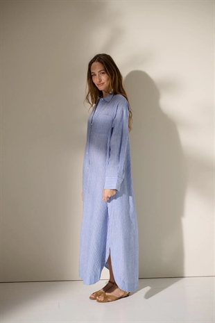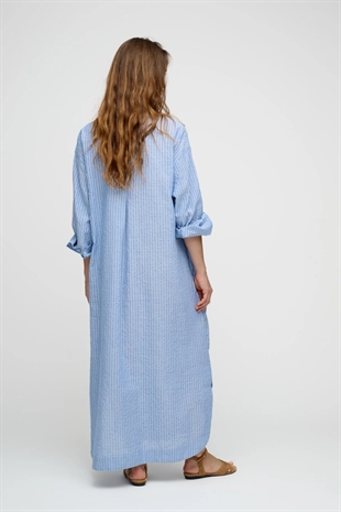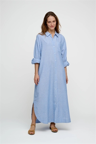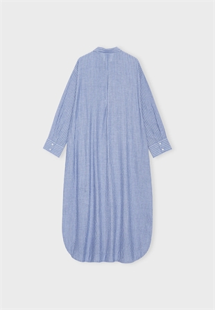 Blåstribet, rummelig og afslappet skjortekjole med feminine detaljer. Skjorten har en blød og afrundet krave, voluminøse ærmer og en smuk plisserings-detalje bagtil.