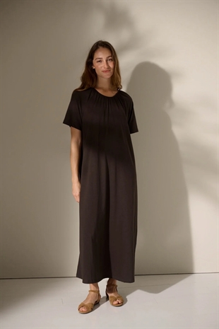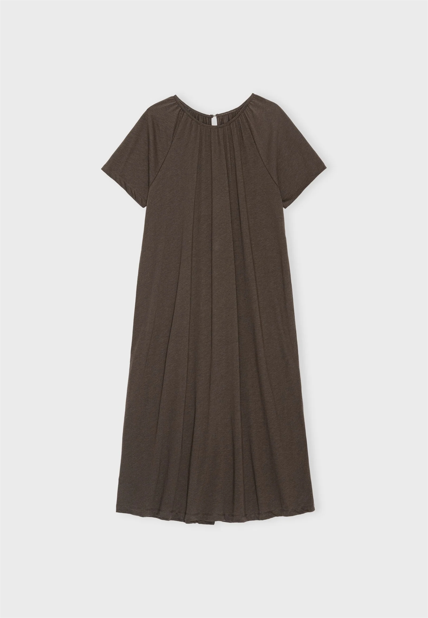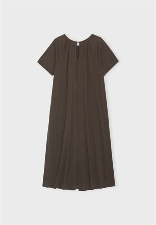 Feminin, mørkebrun sommerkjole med a-formet silhouet i vores klassiske flame jersey. Kjolen har korte raglanærmer og dekorative, fine læg langs halsudskæringen. Som lukning har den en slids med en knap i nakken samt en midterslids bagtil.