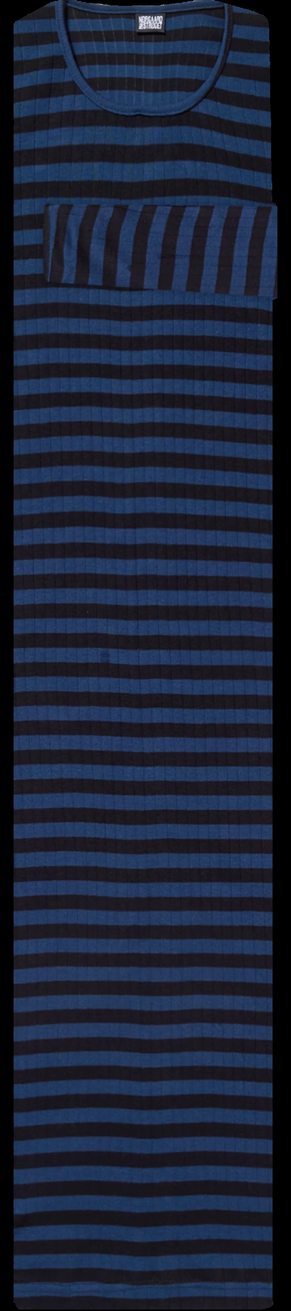 Long John Dress i broadway black/ecru fra Mads Nørgaard. En gulvlang fortolkning af den ikoniske #101 T-shirt fra 1967, strikket og syet i Danmark.