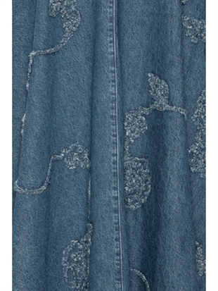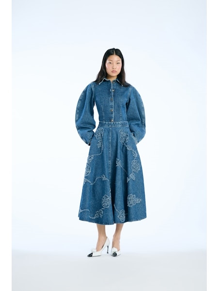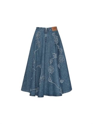 Sejeste denimskirt med broderi af opkradset denim. Den er perfekt til både hverdag og fest, med støvler, sweat, strik, en fin top og en hæl.