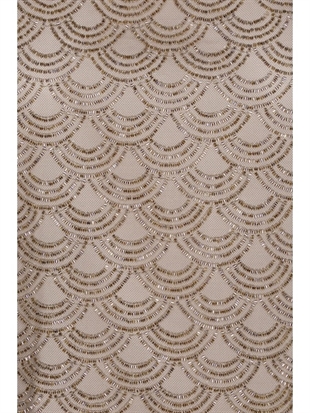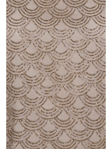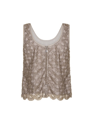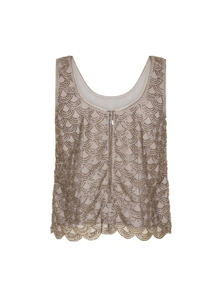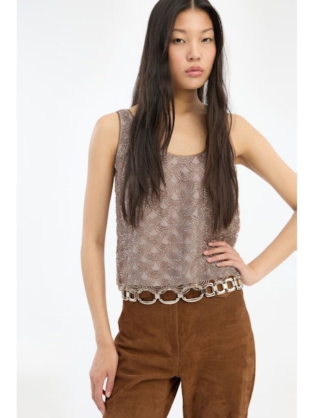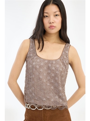 SCALLOP SEQUIN TOP TAUPE er en ærmeløs top i en taupe nuance, dekoreret med pailletter arrangeret i et gentaget bølget mønster. Toppen har en rund halsudskæring og brede skulderstropper. Overfladen har et let transparent udtryk med synlig struktur fra pailletterne, og kanten forneden er afsluttet med en diskret bølget kant. Toppen er foret.