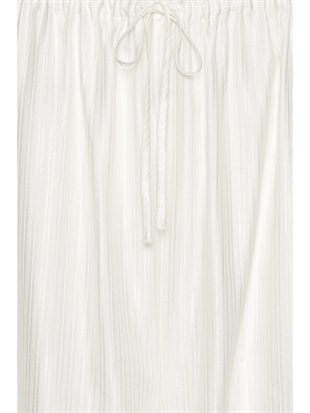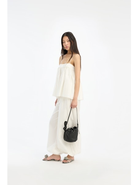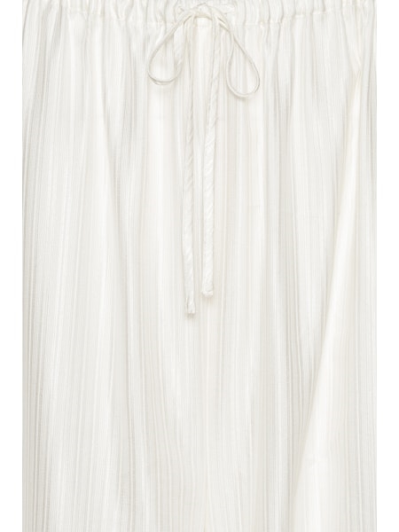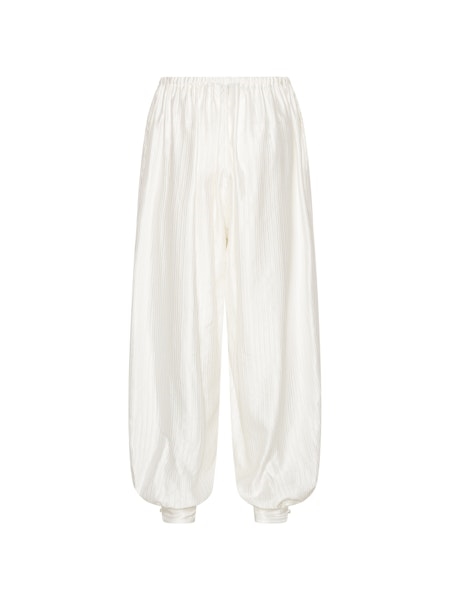 STRIPED BALLOON PANTS BRIGHT WHITE er designet i en klar hvid nuance med en diskret lodret stribet struktur i stoffet. Bukserne har en voluminøs ballon-silhuet med brede ben, der samles i elastiske manchetter ved anklerne. En elastisk talje med synlig snøre giver et afslappet udtryk. Fremstillet i viskose, som giver et let materiale med et blødt fald.