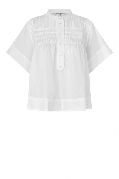 Second Female kortærmet bluse. Blusen er fremstillet i blød, glat bomuld. Rund hals og halv stolpelukning med knapper. Lodrette og vandrette stikninger på brystet. Dobbelt søm på ærmer og forneden. Løs, bred pasform.